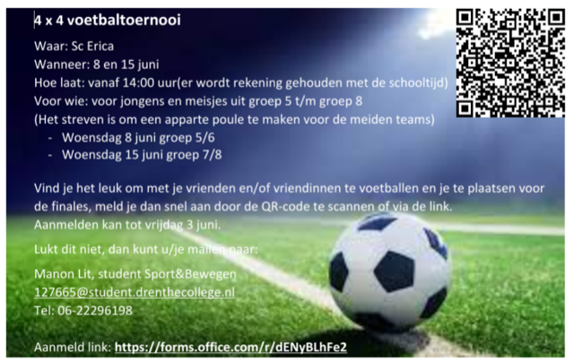 Op woensdag 8 en woensdag 15 juni wordt bij Sc Erica een 4x4 voetbaltoernooi gehouden vanaf 14.00 voor jongens en meisjes uit (school)groep 5 t/m 8. Groep 5/6 op 8 juni en groep 7/8 op 15 juni. Geef je op via onderstaande link of scan de qr code uit de poster.