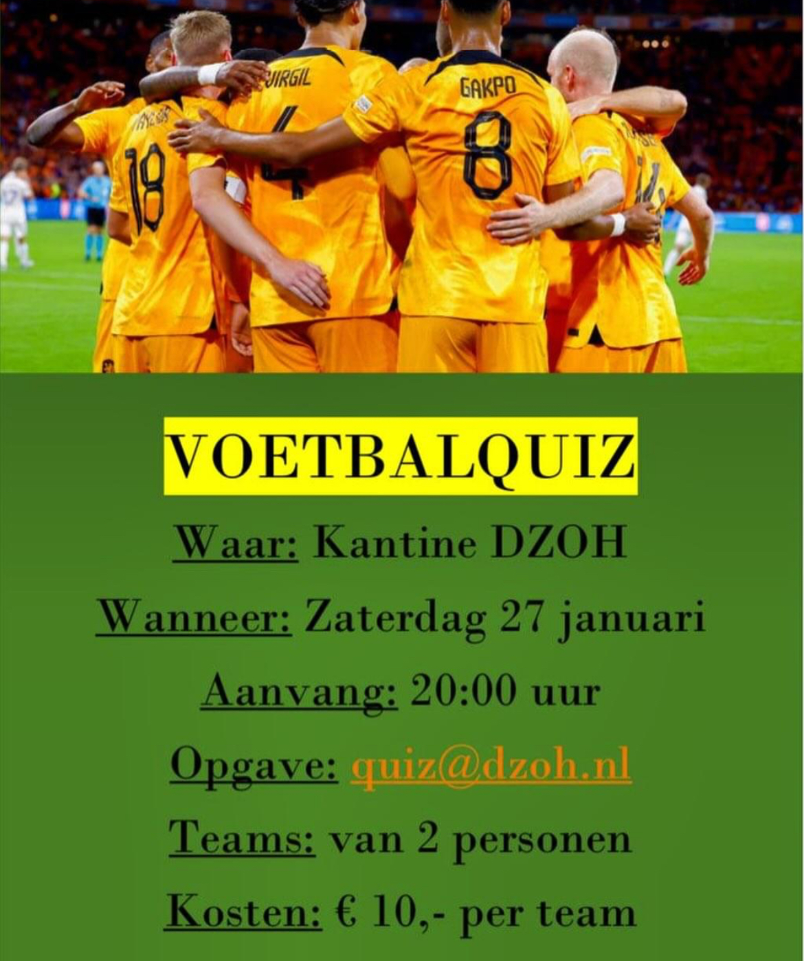 Daar is hij weer! De DZOH voetbalquiz! Zaterdagavond 27 januari kan je het met je beste maatje opnemen tegen andere ‘kenners’! Het belooft wederom een heerlijk avondje te worden. Geef je snel op via quiz@dzoh.nl want vol=vol!