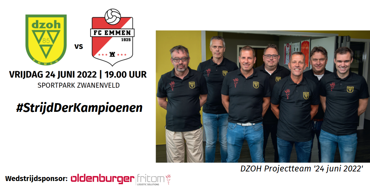 Over 3 dagen, op vrijdag 24 juni a.s., is het zover: de strijdderkampioenen, oftewel de Emmer derby tussen DZOH en FC Emmen. Graag willen we het projectteam, dat is geformeerd om deze wedstrijd in goede banen te leiden, even in de spotlights zetten.