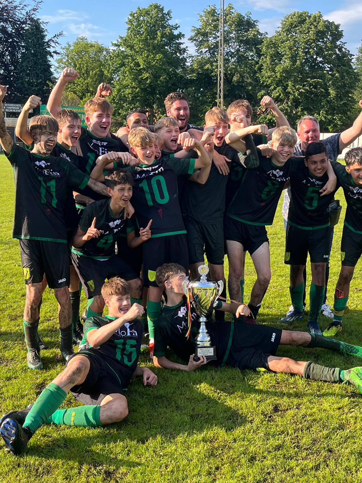 De finale werd gespeeld op een heel slecht en modderig veld tegen een goed voetballende tegenstander, namelijk Peterborough United. Na een spannende wedstrijd die wederom eindigde in een gelijkspel moest de finale beslist worden met penalty’s. Nadat de 2e penalty door DZOH JO15-1 werd gemist stond er een achterstand op het scorebord, maar door 2 fantastische reddingen van de keeper en overtuigend binnengeschoten penalty’s mocht DZOH JO15-1 aanleggen voor de beslissende 5e penalty. Ondanks gefluit vanaf de zijkant werd de penalty binnengeschoten en barste het feest los! DZOH JO15-1 is de winnaar van de Belgische Hageland Cup 2024!