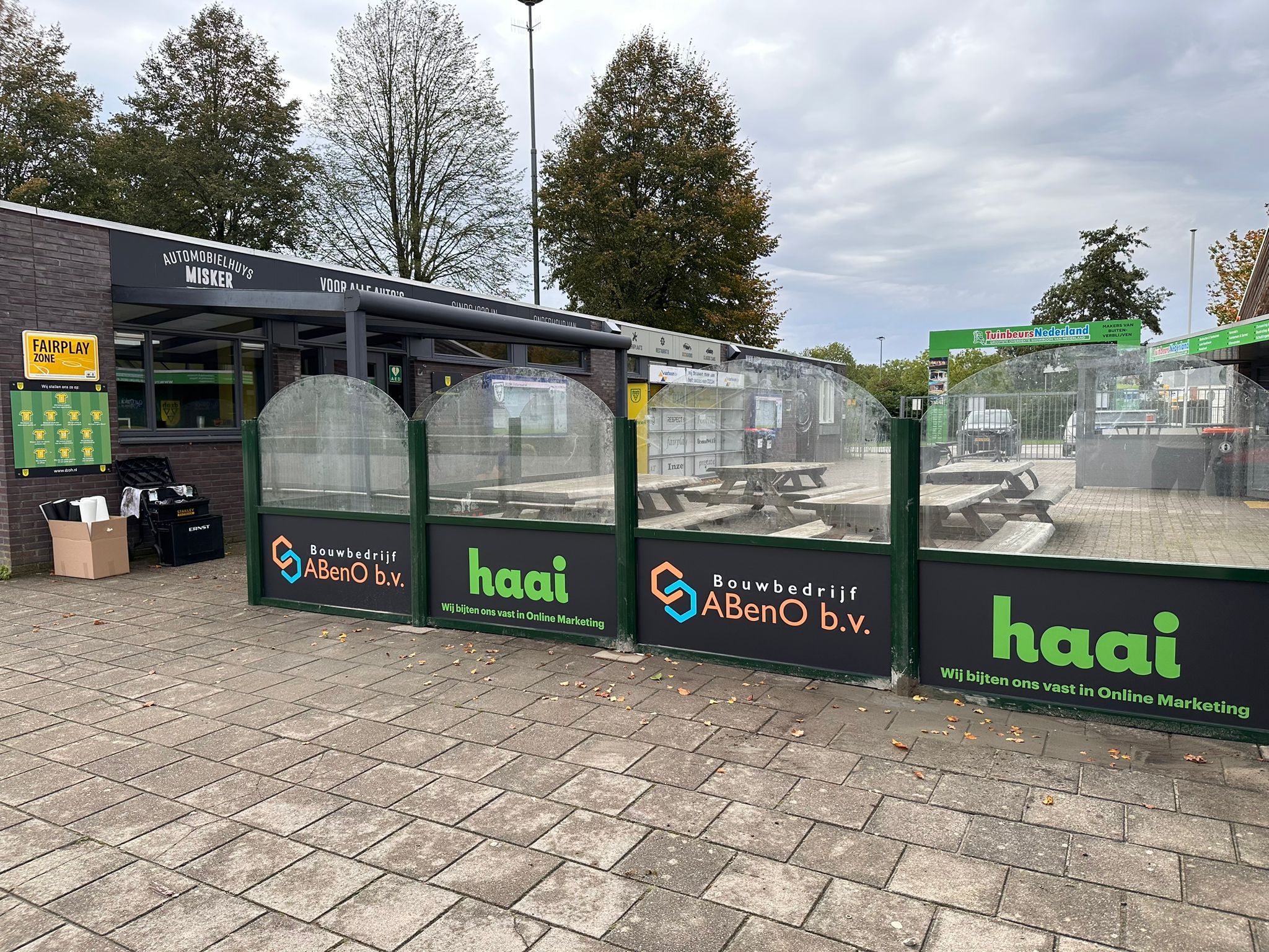 Onze nieuwe sponsoren Haai (Online Marketing) en Bouwbedrijf ABenO hebben er mede voor gezorgd dat wij bij DZOH nu officieel over een afgeschermd terras beschikken! Dankzij de inzet van Quickreclame en vrijwilligers kon het nieuwe terras al snel worden gebruikt.