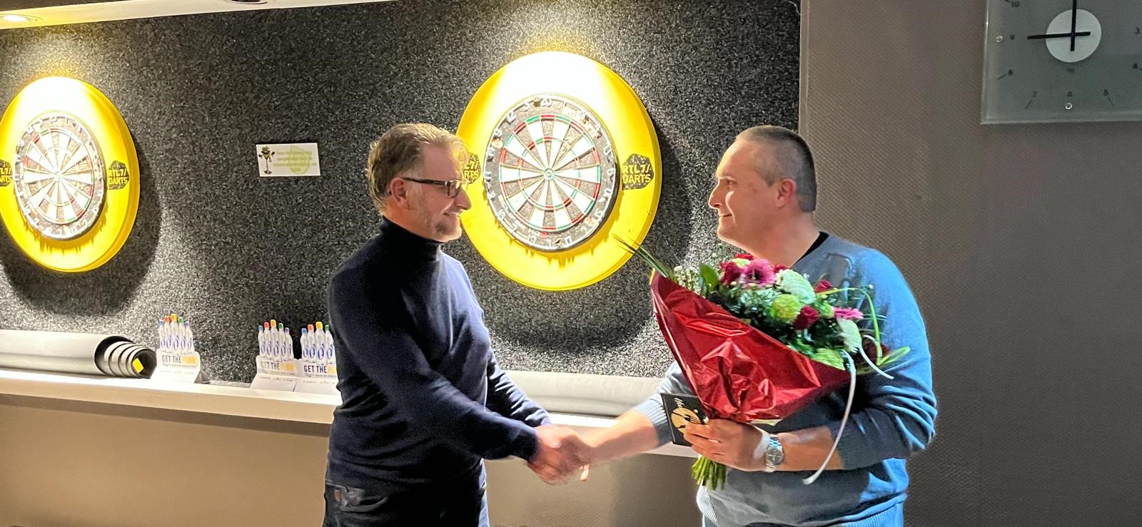 Op de foto overhandigt GInus Gangelhof een bloemetje aan Marco van Gessel die zich niet herkiesbaar stelde en dus de voorzittershamer overdraagt aan Aaldert.