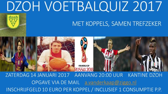 Ook in 2017 organiseren Rieks en Bert weer de jaarlijkse DZOH voetbalquiz. 14 januari is het zover, ditmaal de 7e editie. Ook deze keer is er plaats voor 30 koppels. Ben jij een echte voetbalkenner, geef je dan snel op. Zie het affiche voor verdere informatie.