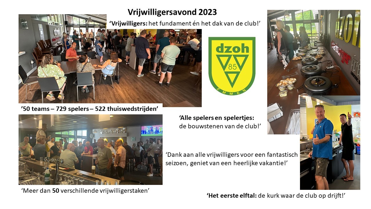 Maar, het aantal vrijwilligers is het afgelopen seizoen behoorlijk toegenomen. Dat is een verdienste van jewelste maar de mensen zien ook waar we allemaal mee bezig zijn. Deze week hoorde ik nog dat zich weer drie mensen hebben aangemeld voor het klusteam. Ik weiger ten ene male mee te gaan in de teneur dat het steeds moeilijker wordt om vrijwilligers te krijgen. Kijk naar vv Emmen, Asser Boys, gerenommeerde clubs die daardoor op omvallen staan. Of de Rietplasloop die door een gebrek aan vrijwilligers ter ziele is gegaan.. Of FC Klazienaveen waar een vrijwilligersbijdrage is ingevoerd . Niet uit luxe. Maar 40,- euro vrijwilligersbijdrage tapt geen bier en fluit geen wedstrijdjes. Dus, voor ons allemaal: maak mensen enthousiast en trek ze club in. Bij DZOH hebben we geen vrijwilligersprobleem. Punt! Ik zal daar ook persoonlijk keihard voor knokken.